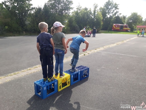 Nur im Team konnte die Strecke beim Kastenlauf von den Kindern überwunden werden. Beim Dosenwerfen war Zielgenauigkeit gefragt. Herausfordernd war auch der Hindernisparcours welcher aus zahlreichen Ausrüstungsgegenständen des Feuerwehrfahrzeugs bestand. Natürlich durfte das Element Wasser nicht fehlen und so hatten alle einen riesigen Spaß und die Zeit verging wie im Flug.