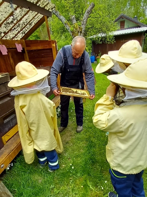 Nach einem kurzen Spaziergang erreichten unsere kleinen das Bienenhaus und wurden vom Imker Georg empfangen. Der Imker zeigte die Haltung von Bienen früher im Bienenstock im Vergleich zu den heutigen Holzbeuten. Das Bienenvolk wurde natürlich genau begutachtet. Durch einen Schaukasten konnten unsere kleinsten die Königin im Volk suchen und das fleißige Arbeiten der Bienen bestaunen.