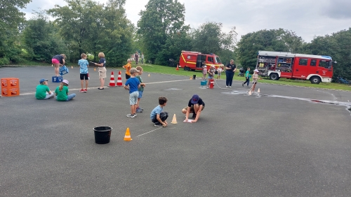 Eine große Herausforderung für die 29 Teilnehmer war hier der Hindernisparcours, welcher aus zahlreichen Ausrüstungsgegenständen des Feuerwehrfahrzeugs bestand, einen Tennisball auf dem Strahlrohr zu balancieren. Auch bei allen anderen Stationen wie Zielspritzen, Kastenlauf, Leiter- Golf, Wikinger-Schach und Gummistiefel- Weitwurf zeigten die Kinder vollen Einsatz. An der letzten Station beim Sackhüpfen mussten die Kids im Team antreten. Beim gemeinsamen Hüpfen in einem BigPack kam es vor allem auf das perfekte Timing und die Koordination an, um nicht auf der Nase zu landen.